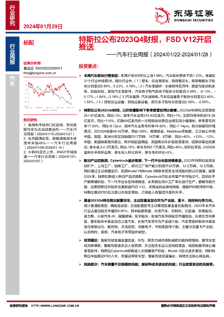 东海证券:汽车行业周报(2024/01/22-2024/01/28):特斯拉公布2023Q4财报,FSD V12开启推送.pdf
