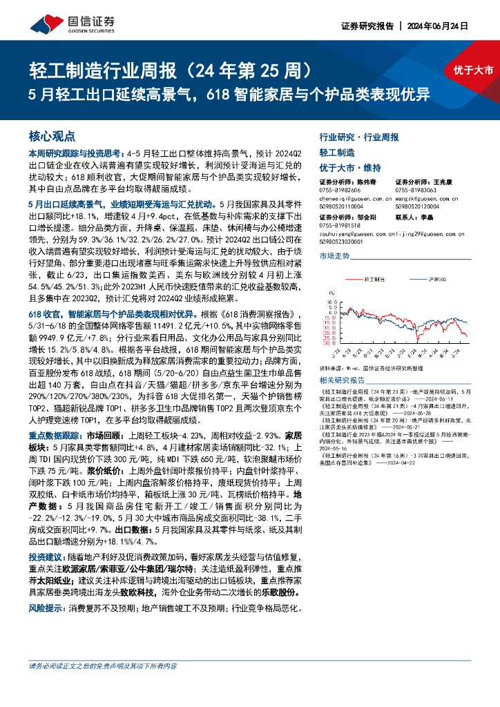 国信证券:轻工制造行业周报(24年第25周):5月轻工出口延续高景气,618智能家居与个护品类表现优异.pdf