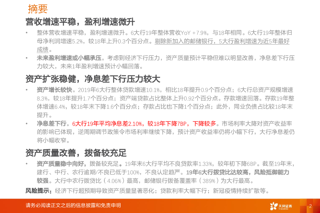 天风证券:银行行业专题研究:6大行19年报综述:业绩较好,或催化估值修复.pdf