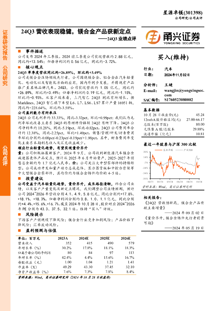 甬兴证券:星源卓镁(301398)-24Q3业绩点评:24Q3营收表现稳健,镁合金产品获新定点.pdf