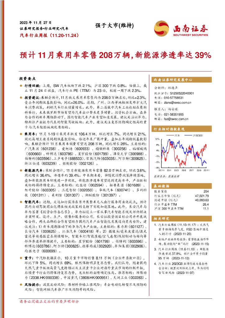 西南证券:汽车行业周报:预计11月乘用车零售208万辆,新能源渗透率达39%.pdf