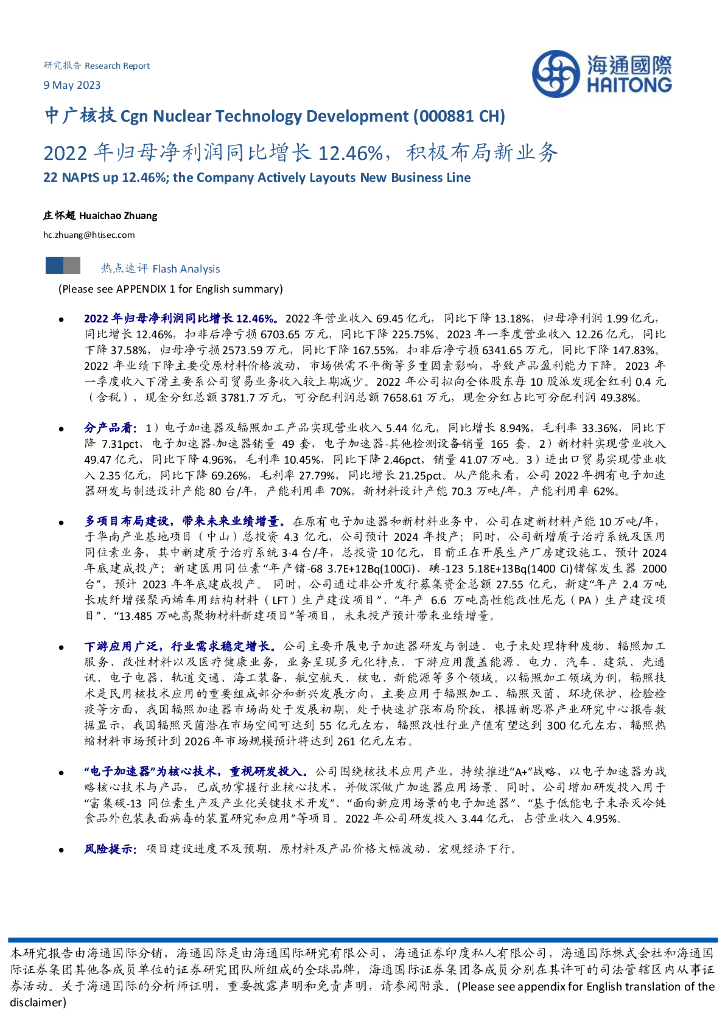 海通国际:中广核技(000881)-2022年归母净利润同比增长12.46%,积极布局新业务.pdf