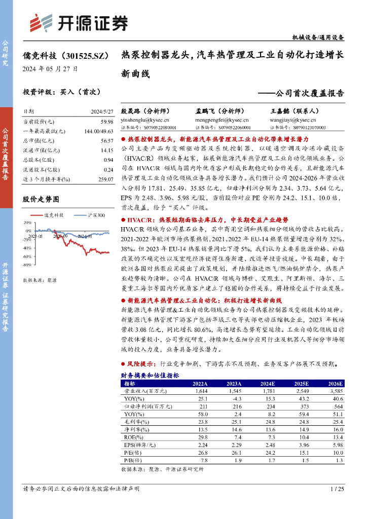 开源证券:儒竞科技(301525)-公司首次覆盖报告:热泵控制器龙头,汽车热管理及工业自动化打造增长新曲线.pdf
