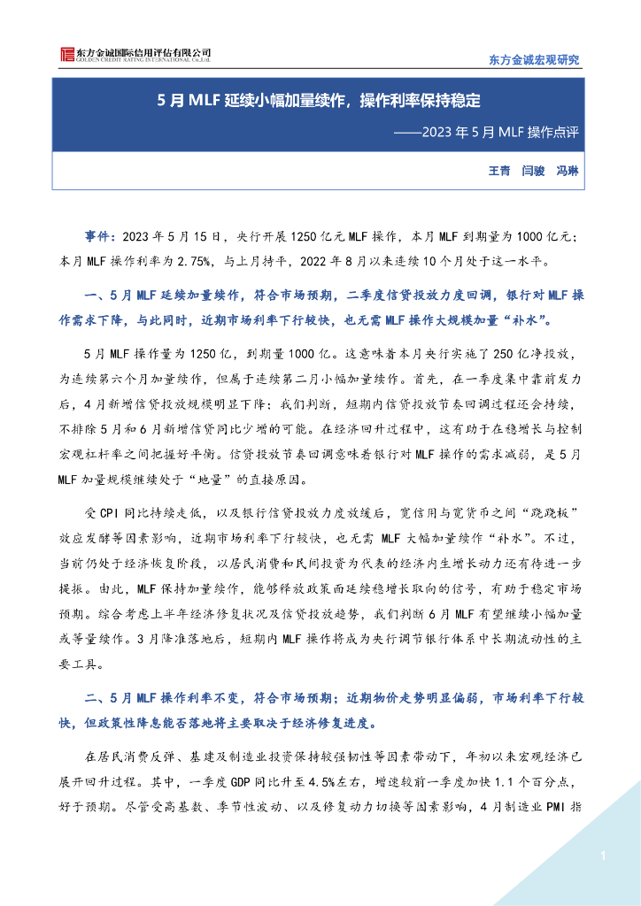 东方金诚:5月MLF延续小幅加量续作,操作利率保持稳定(2023年5月MLF操作解读).pdf