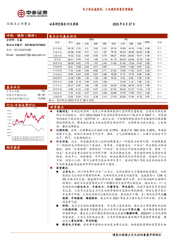 中泰证券:环保及公用事业行业周报:电力供应偏紧张,火电建设投资有望提速.pdf