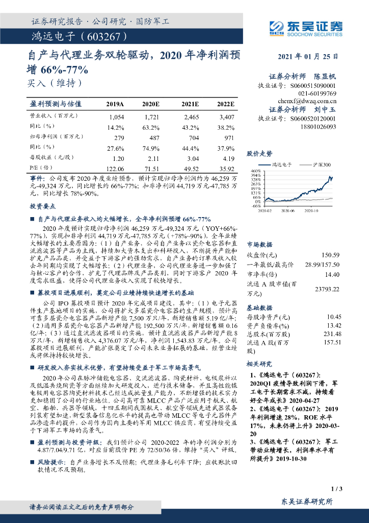 东吴证券:鸿远电子(603267)-自产与代理业务双轮驱动,2020年净利润预增66%-77%.pdf