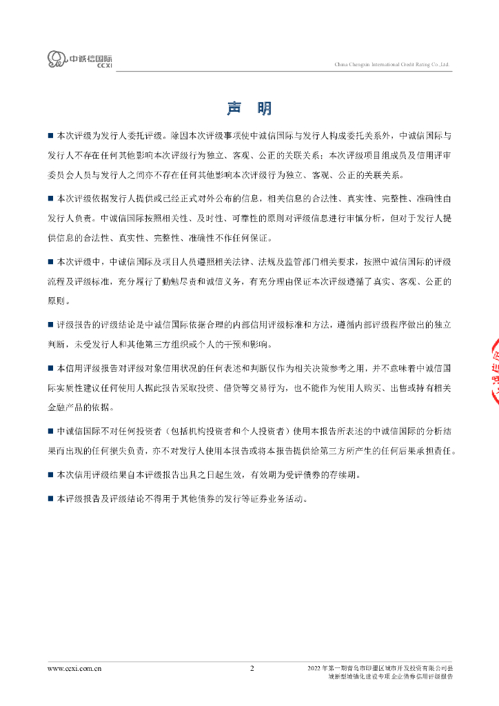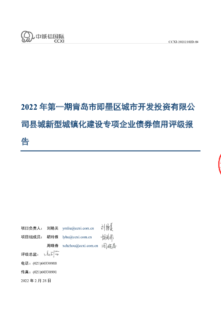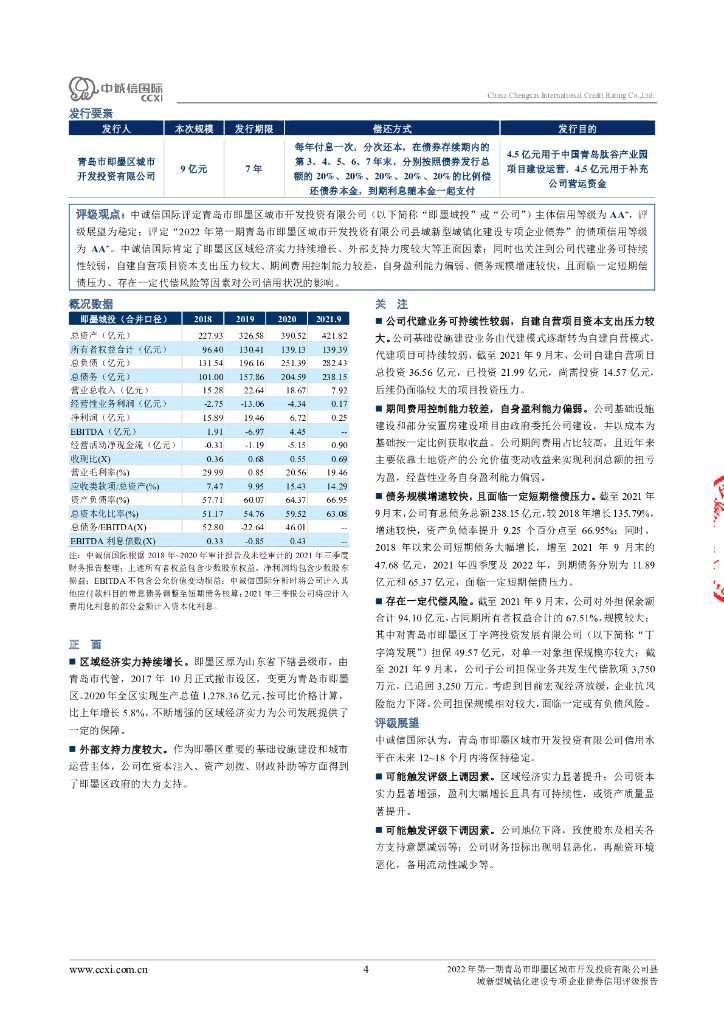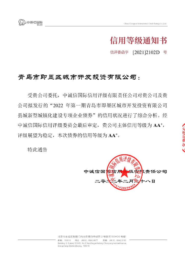 中诚信:2022年第一期青岛市即墨区城市开发投资有限公司县城新型城镇化建设专项企业债券信用评级报告.pdf