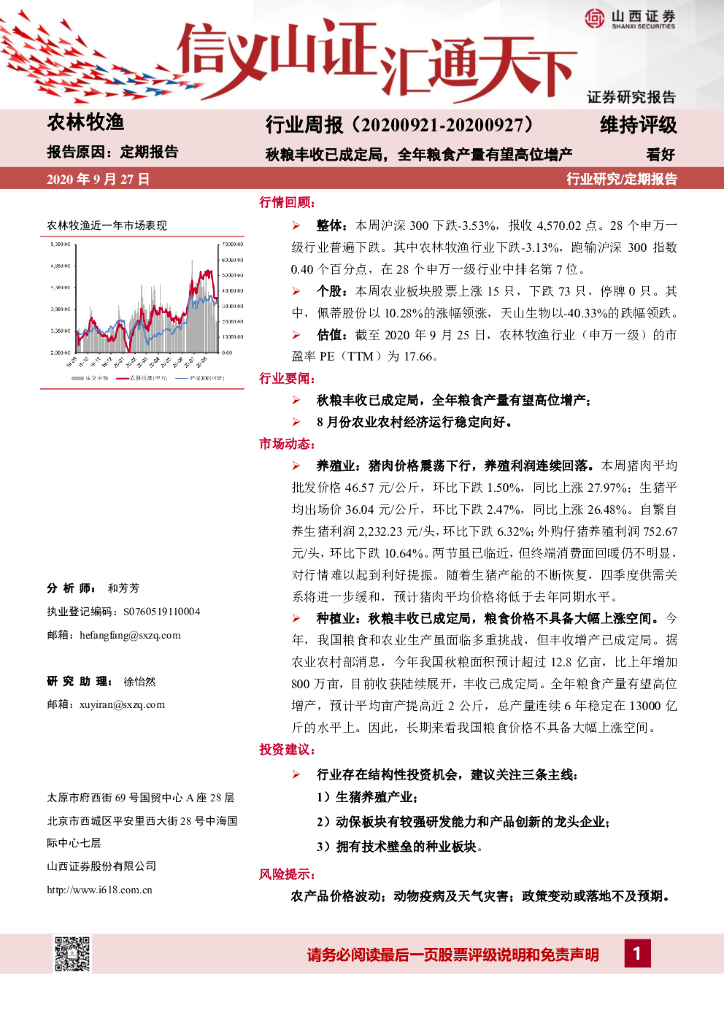 山西证券:农林牧渔行业周报:秋粮丰收已成定局,全年粮食产量有望高位增产.pdf