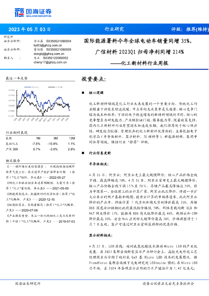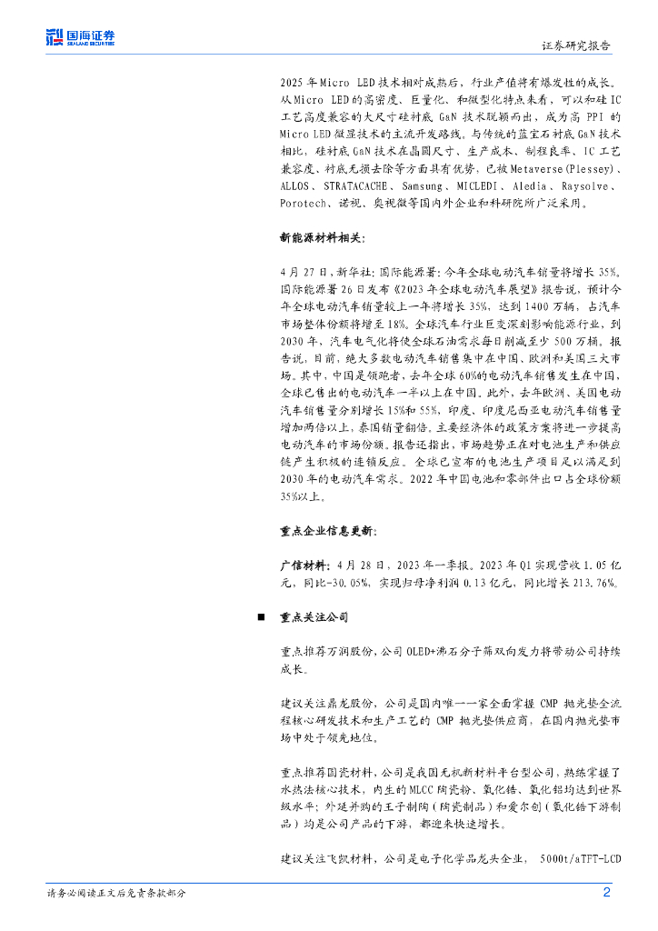 国海证券:化工新材料行业周报:国际能源署料今年全球电动车销量同增35%,广信材料2023Q1归母净利同增214%.pdf