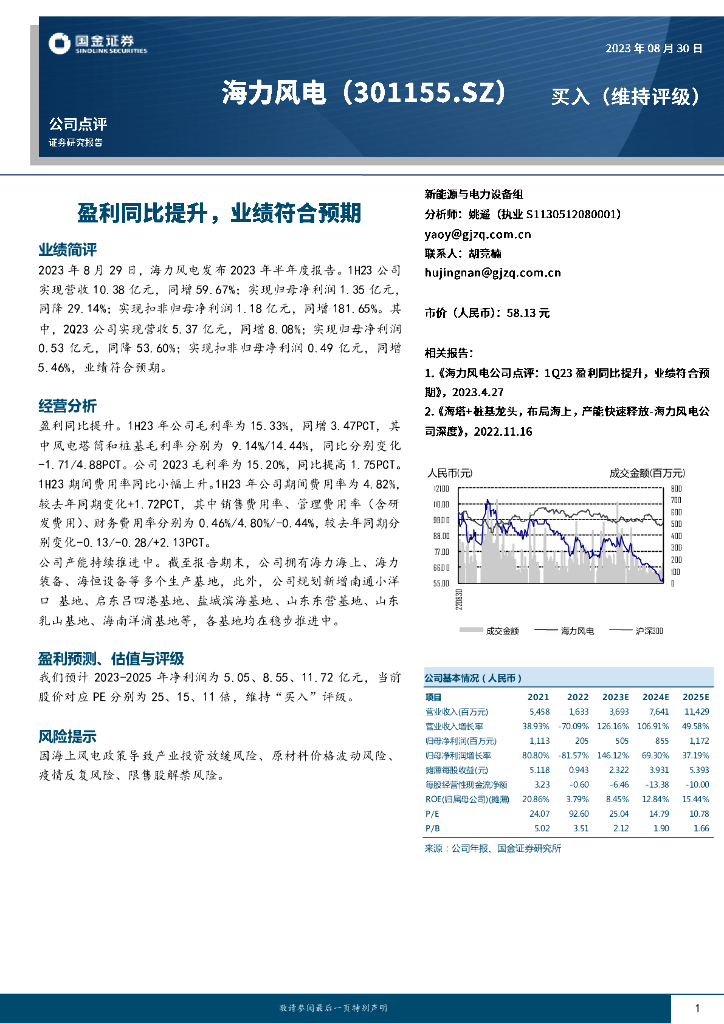 国金证券:海力风电(301155)-盈利同比提升,业绩符合预期.pdf