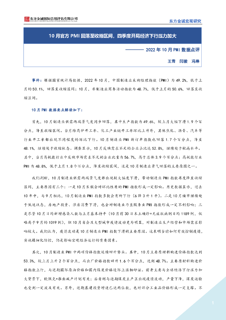 东方金诚:2022年10月PMI数据点评-10月制造业PMI回落至收缩区间,四季度开局经济下行压力加大.pdf