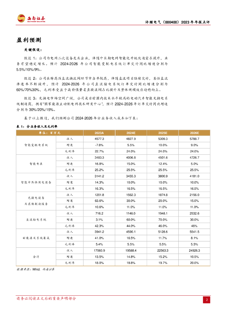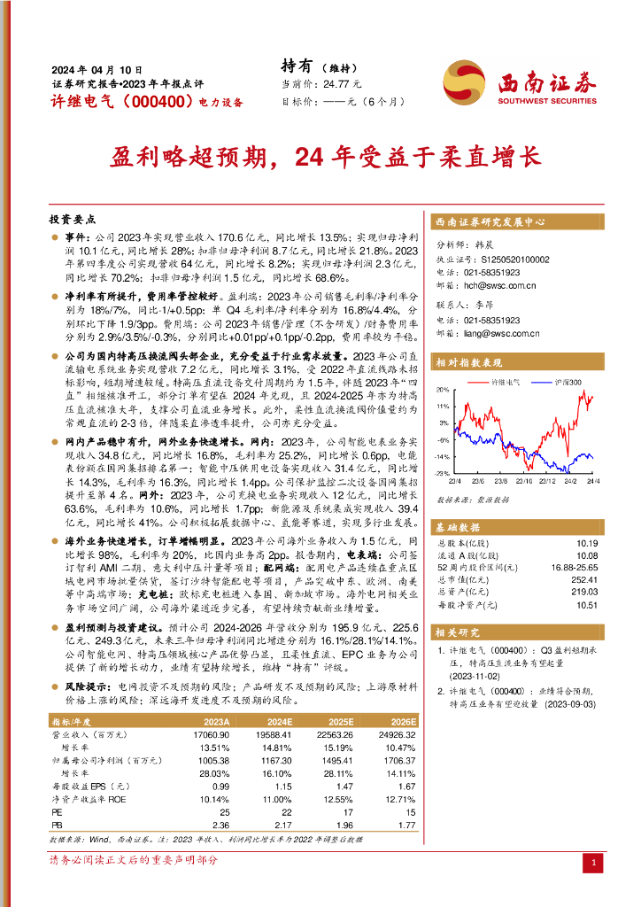 西南证券:许继电气(000400)-盈利略超预期,24年受益于柔直增长.pdf