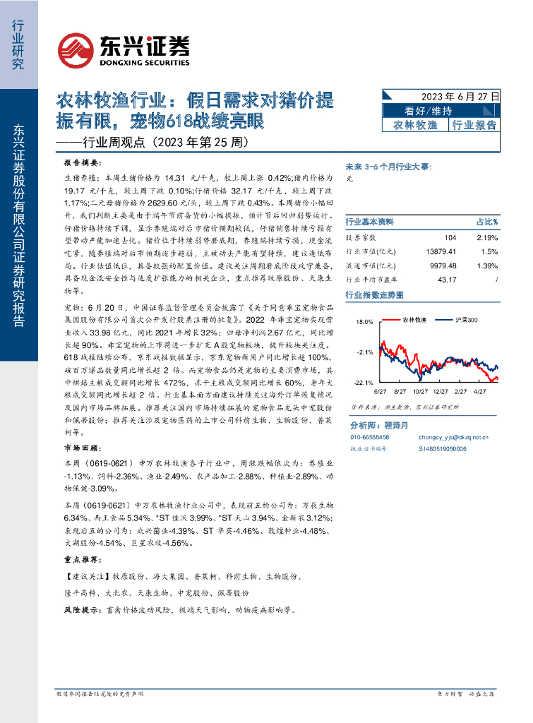 东兴证券:农林牧渔行业周观点(2023年第25周):假日需求对猪价提振有限,宠物618战绩亮眼.pdf