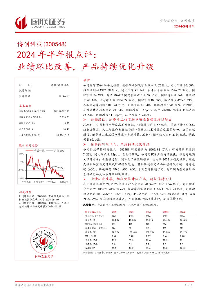 国联证券:博创科技(300548)-2024年半年报点评:业绩环比改善,产品持续优化升级.pdf