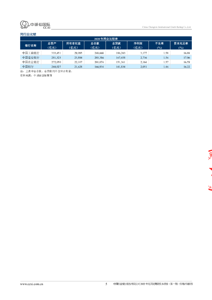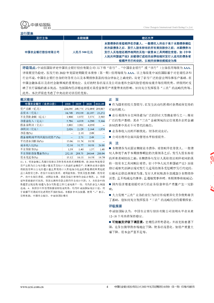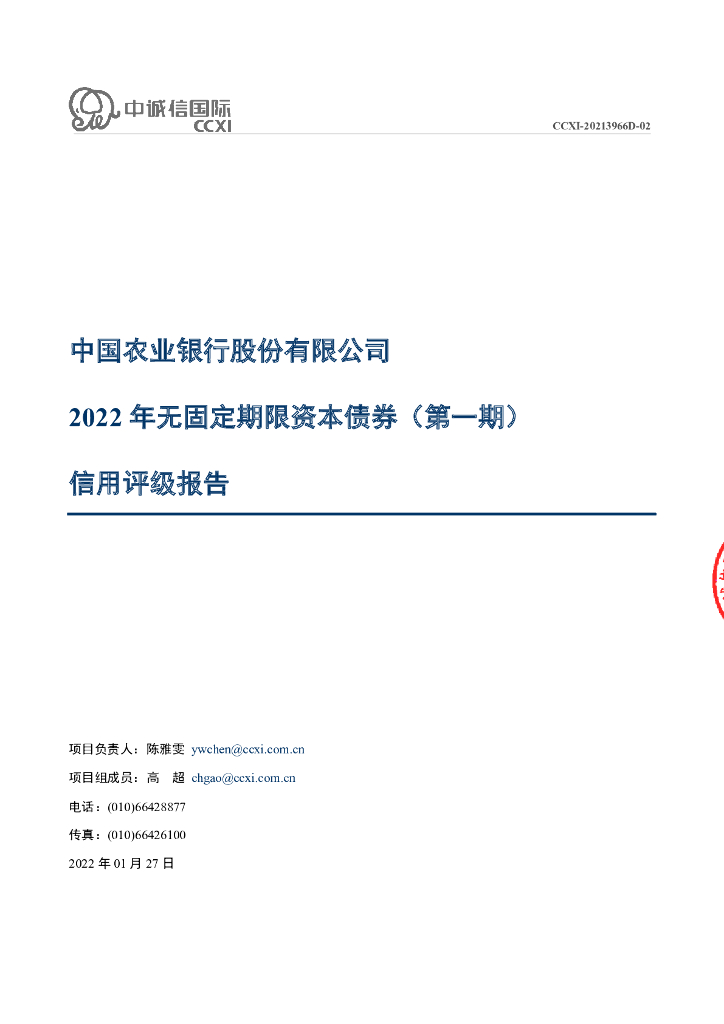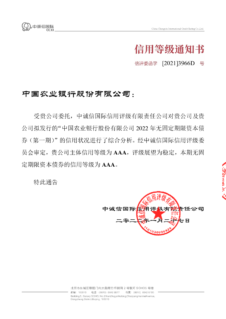 中诚信:中国农业银行股份有限公司2022年无固定期限资本债券(第一期)信用评级报告及跟踪评级安排的说明.pdf