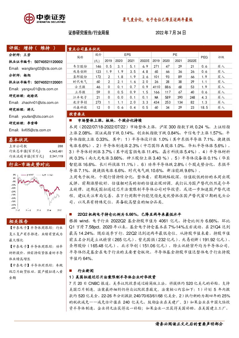 中泰证券:电子行业周报:景气度分化,电子仓位已降至近两年最低.pdf