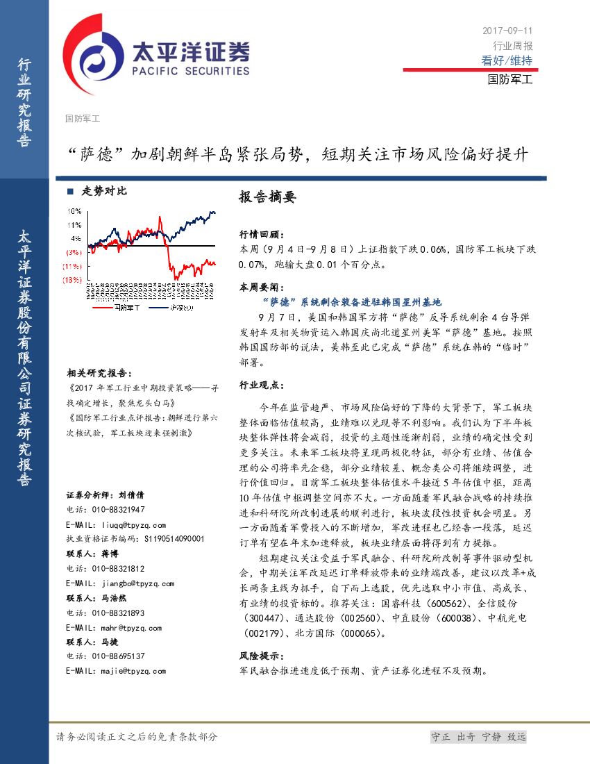 太平洋证券:国防军工行业周报:“萨德”加剧朝鲜半岛紧张局势,短期关注市场风险偏好提升.pdf