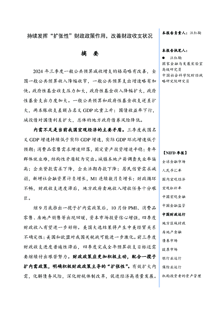 NIFD季报:持续发挥“扩张性”财政政策作用,改善财政收支状况——2024年Q3中国财政运行.pdf