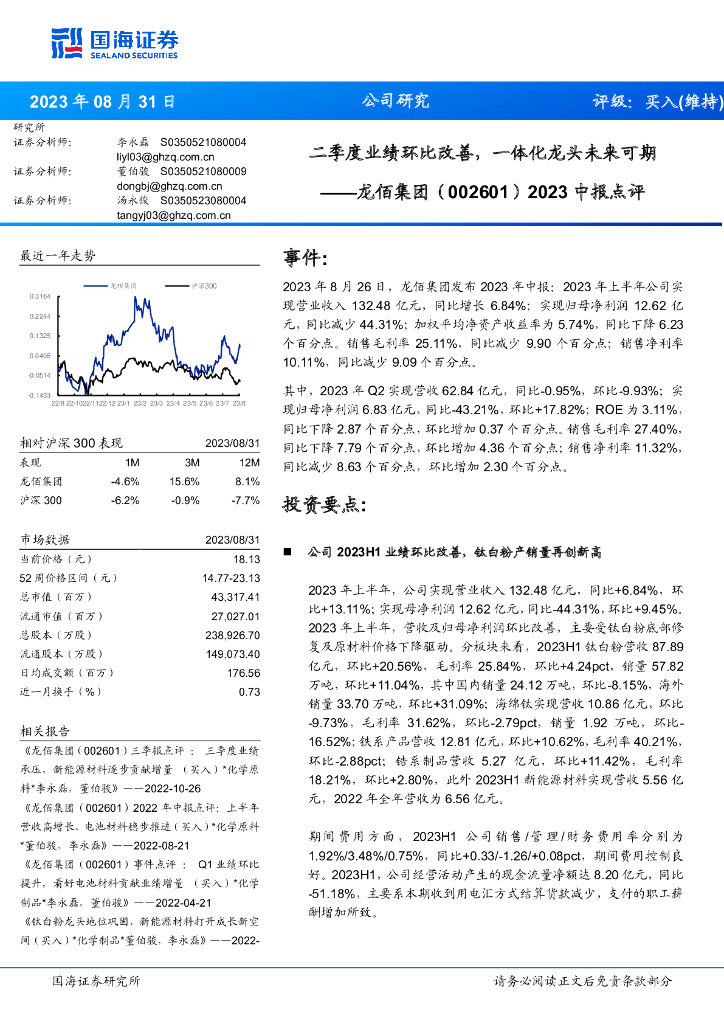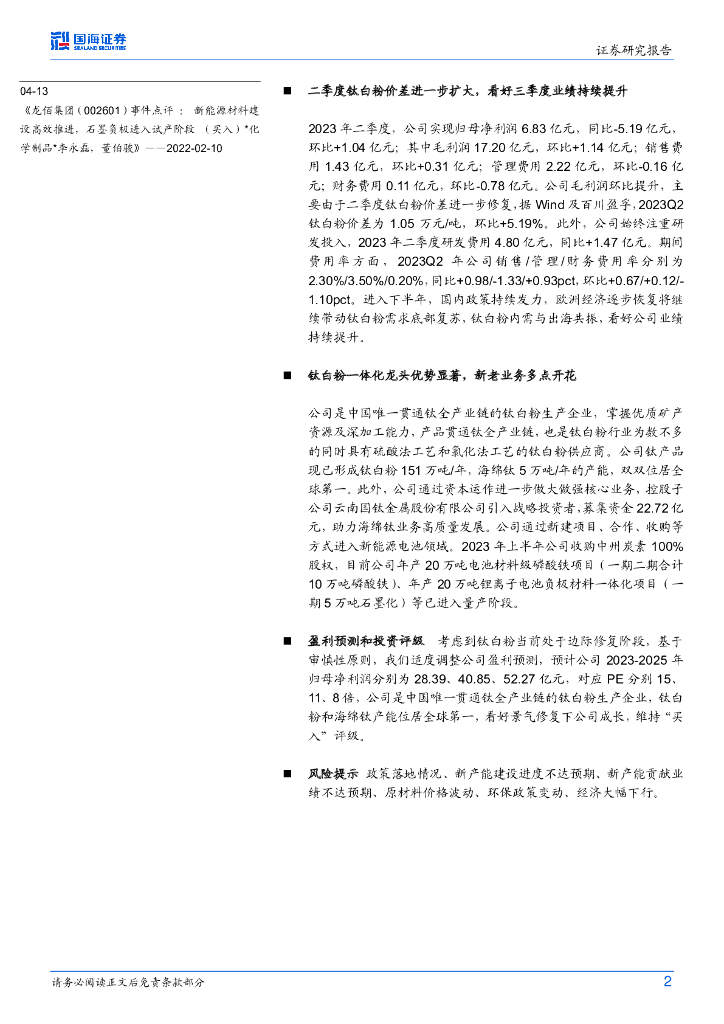 国海证券:龙佰集团(002601)-2023中报点评:二季度业绩环比改善,一体化龙头未来可期.pdf
