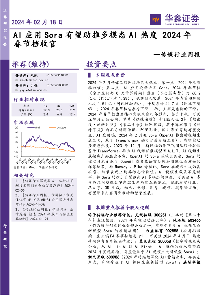 华鑫证券:传媒行业周报:AI应用Sora有望助推多模态AI热度 2024年春节档收官.pdf