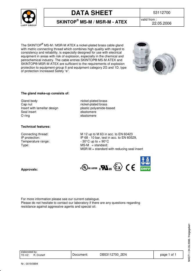 LAPP KABEL SKINTOP MS-M / MSR-M - ATEX 数据手册.pdf