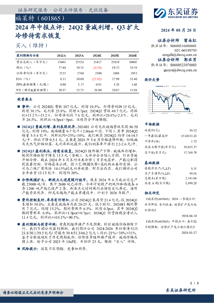 东吴证券:福莱特(601865)-2024年中报点评:24Q2量减利增,Q3扩大冷修待需求恢复.pdf