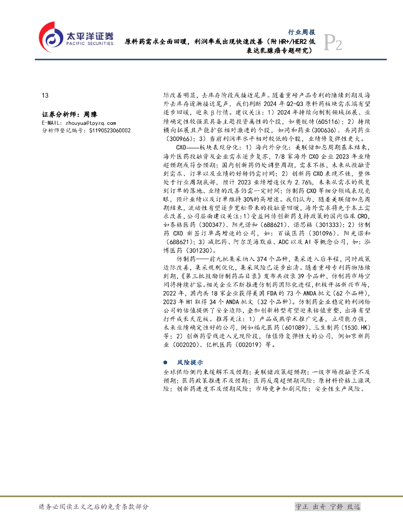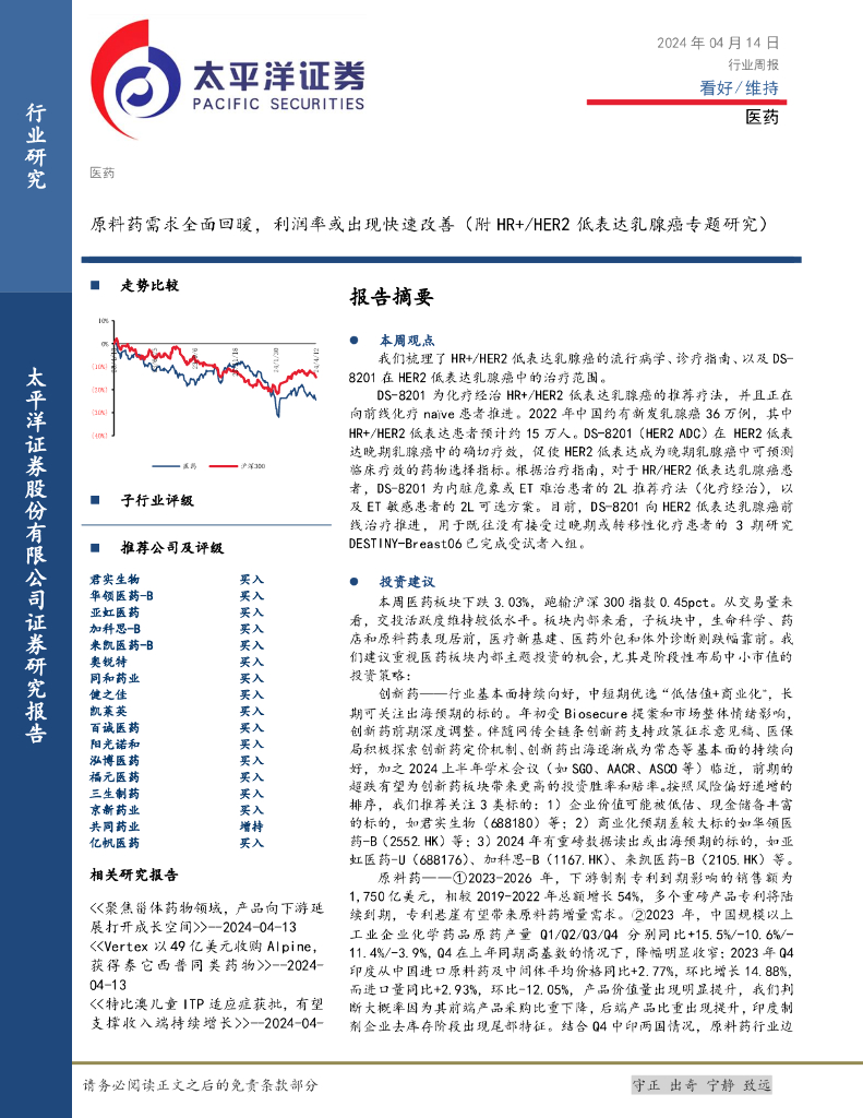 太平洋证券:医药行业周报:原料药需求全面回暖,利润率或出现快速改善(附HR+/HER2低表达乳腺癌专题研究).pdf