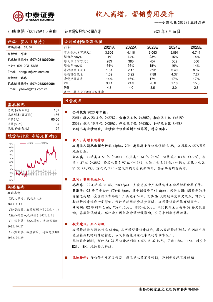 中泰证券:小熊电器2023H1业绩点评:收入高增,营销费用提升.pdf
