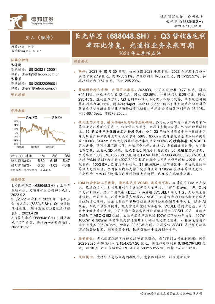 德邦证券:长光华芯(688048)-2023年三季报点评:Q3营收&毛利率环比修复,光通信业务未来可期.pdf