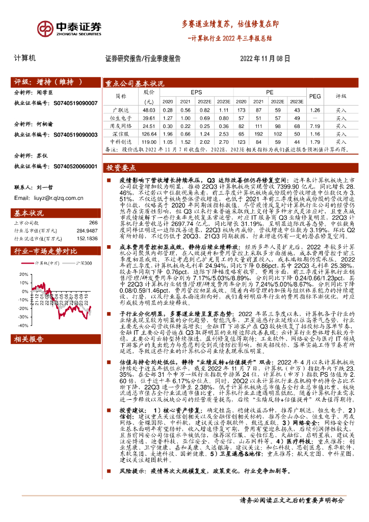 中泰证券:计算机行业2022年三季报总结:多赛道业绩复苏,估值修复在即.pdf