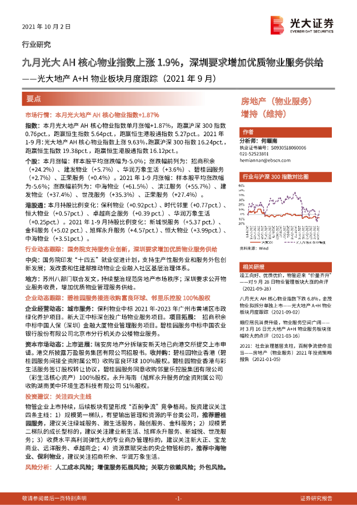 光大证券:光大地产A+H物业板块月度跟踪(2021年9月):九月光大AH核心物业指数上涨1.9%,深圳要求增加优质物业服务供给.pdf