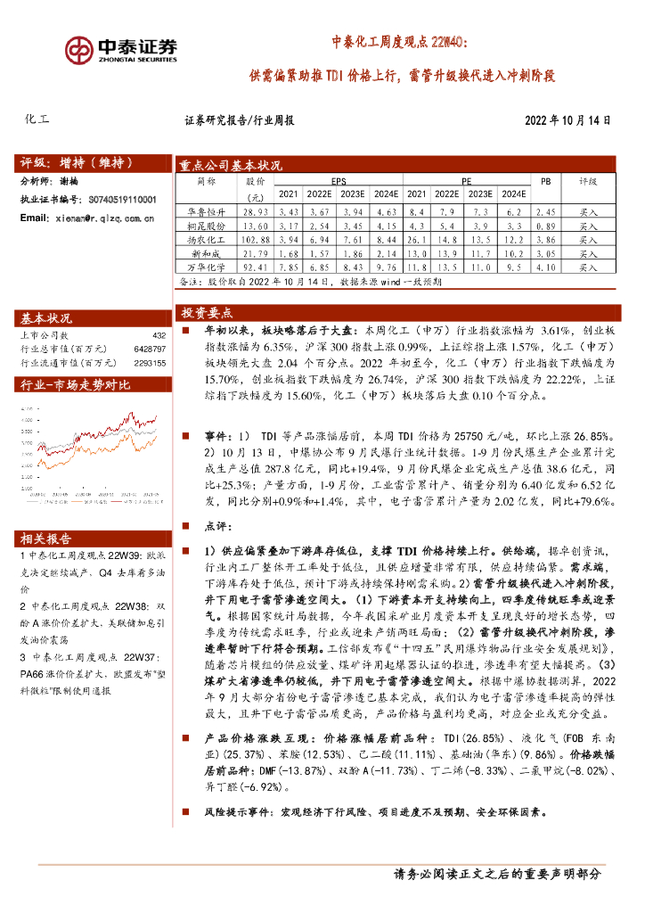 中泰证券:中泰化工周度观点22W40:供需偏紧助推TDI价格上行,雷管升级换代进入冲刺阶段.pdf