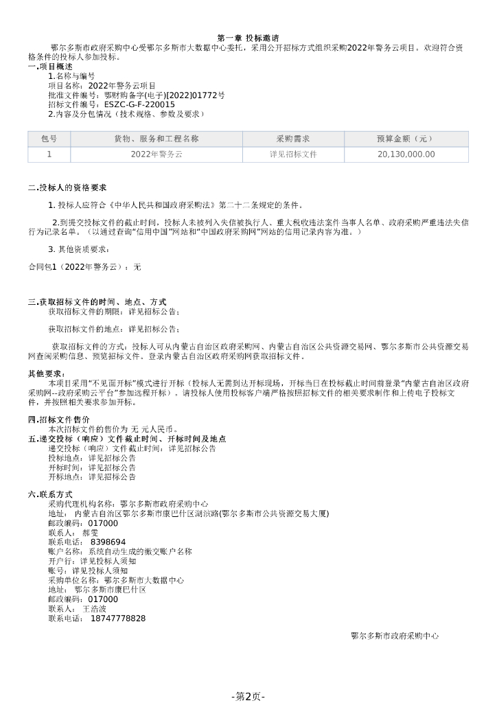 鄂尔多斯市政府采购中心公开招标文件:鄂尔多斯市大数据中心采购2022年警务云项目.pdf