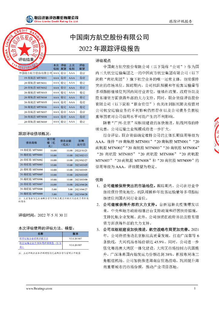 联合资信:中国南方航空股份有限公司2022年跟踪评级报告.pdf