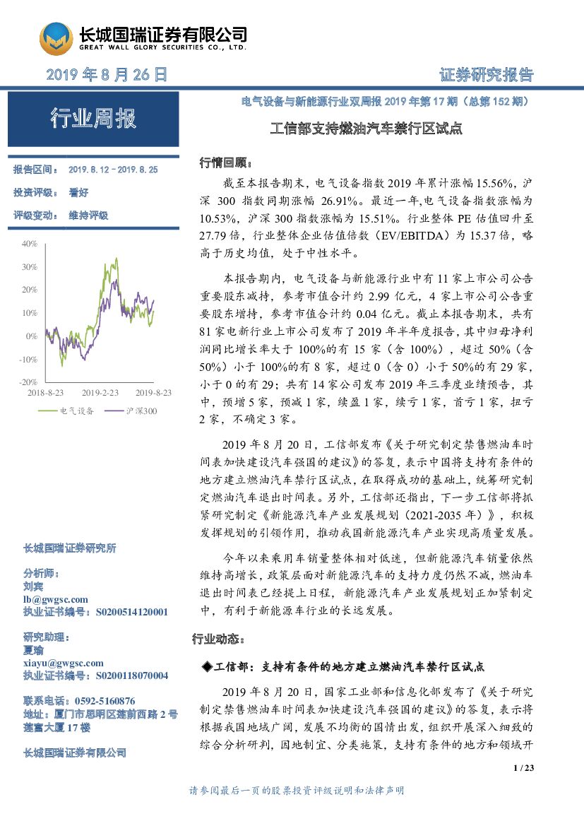长城国瑞证券:电气设备与新能源行业双周报2019年第17期(总第152期):工信部支持燃油汽车禁行区试点.pdf