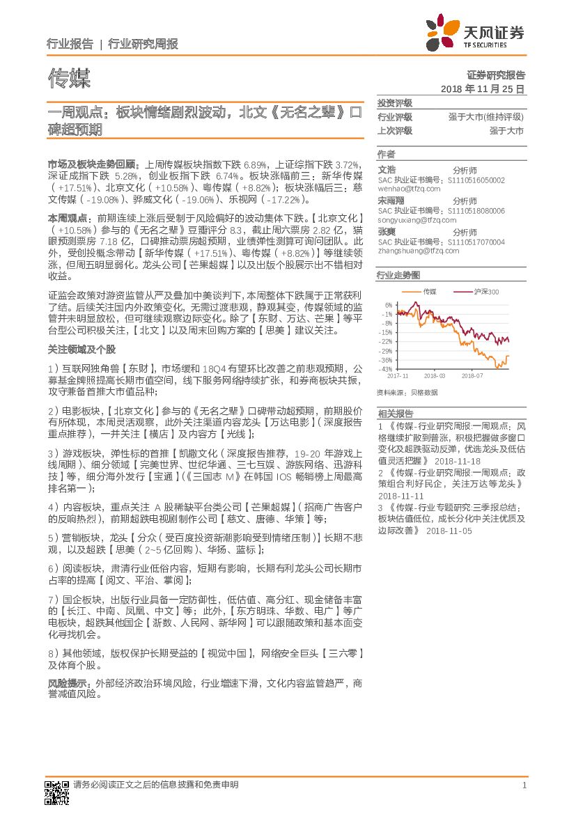 天风证券:传媒行业一周观点:板块情绪剧烈波动,北文《无名之辈》口碑超预期.pdf