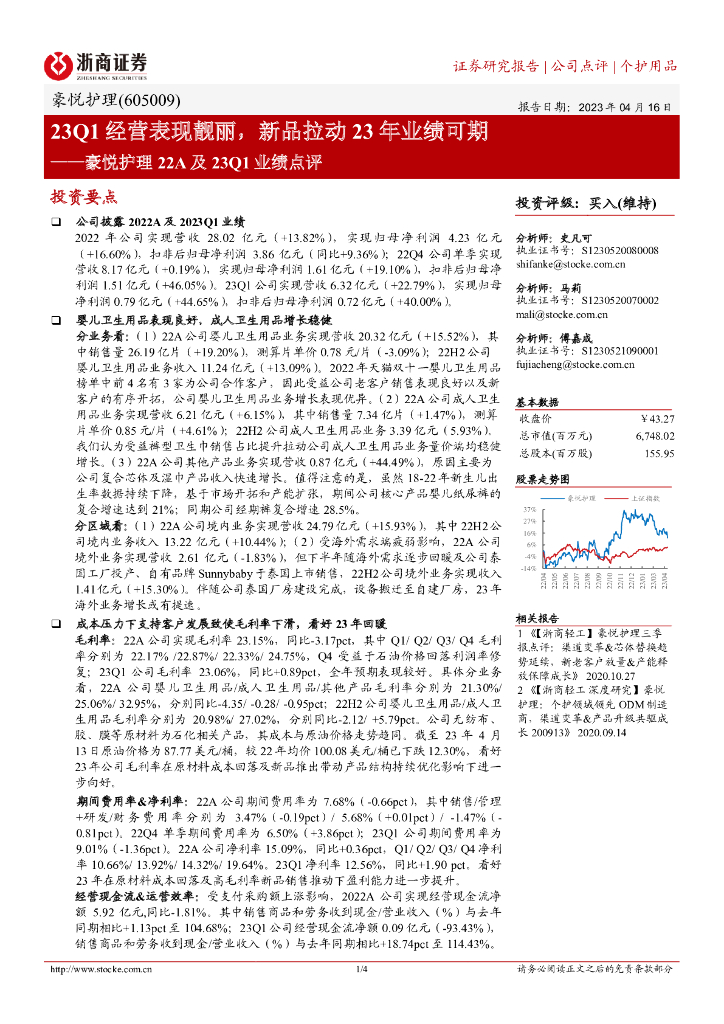 浙商证券:豪悦护理22A及23Q1业绩点评:23Q1经营表现靓丽,新品拉动23年业绩可期.pdf
