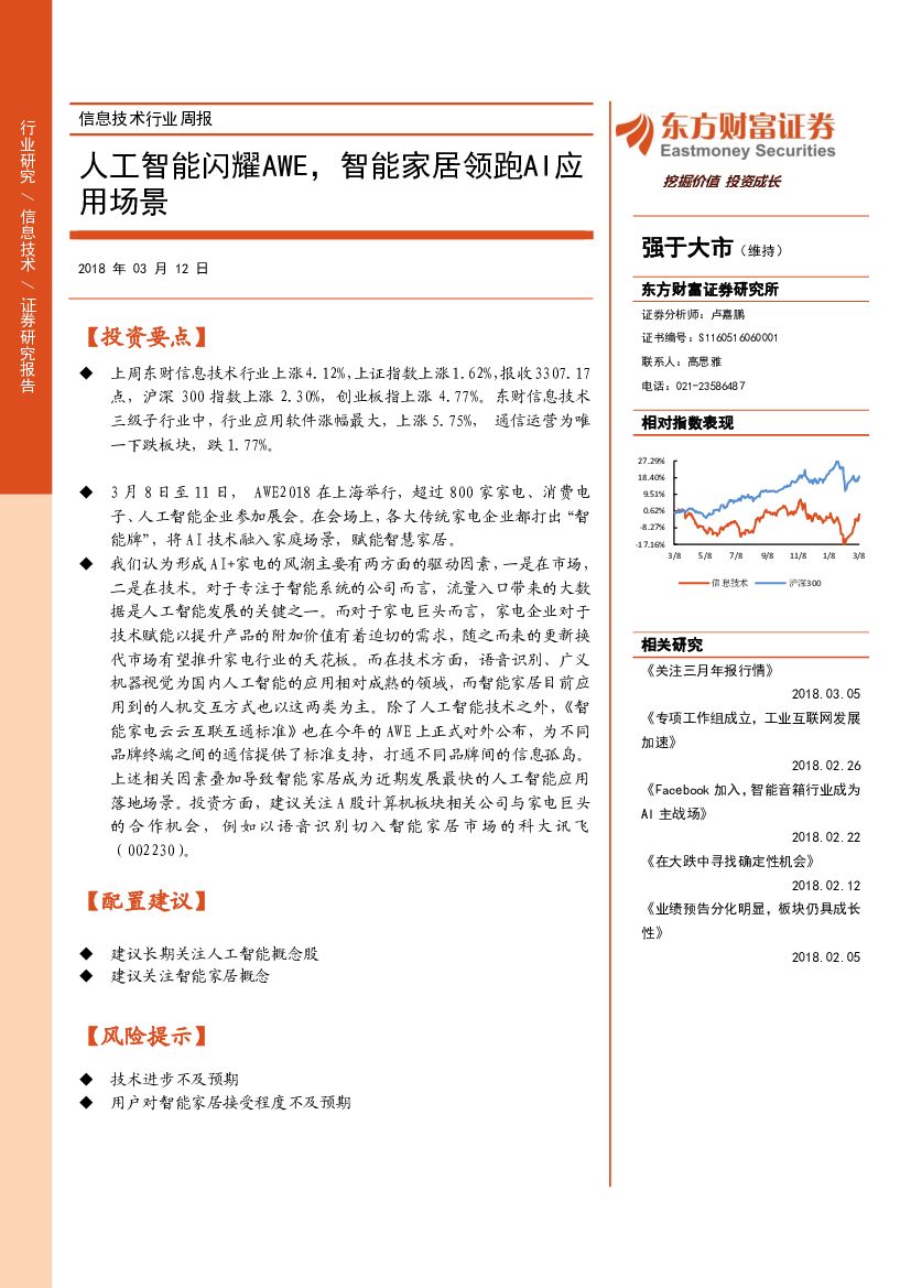 东方财富证券:信息技术行业周报:人工智能闪耀AWE,智能家居领跑AI应用场景.pdf