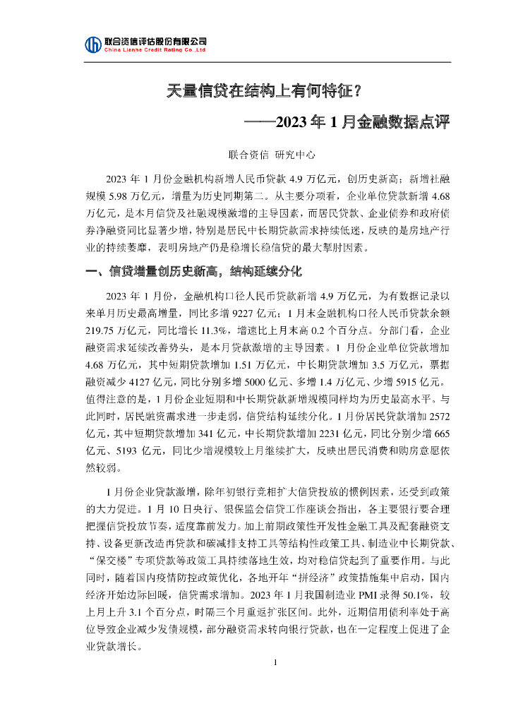 联合资信:天量信贷在结构上有何特征?-2023年1月金融数据点评.pdf