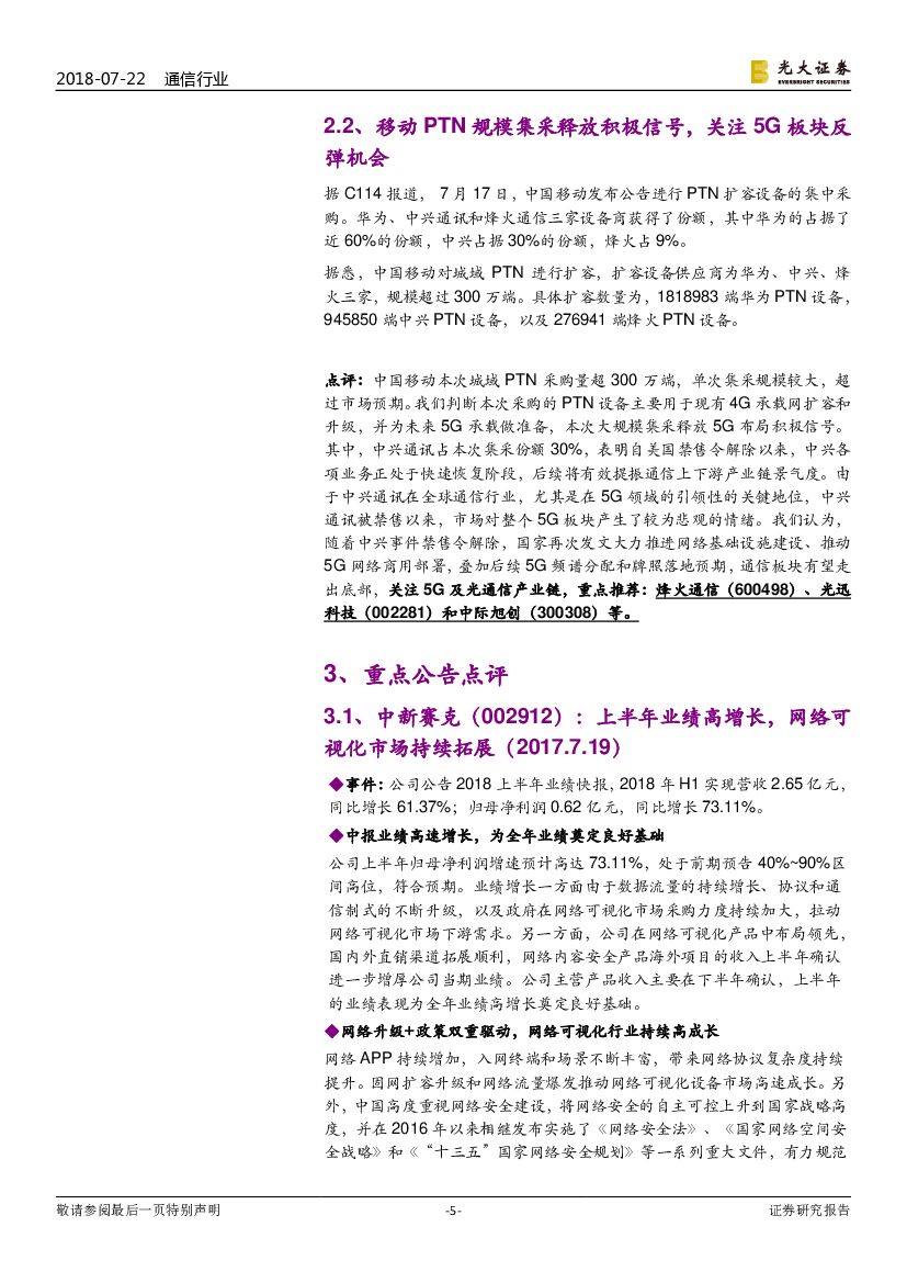 光大证券:通信行业2018年第30周周报:移动PTN规模集采释放积极信号,关注5G板块反弹机会.pdf