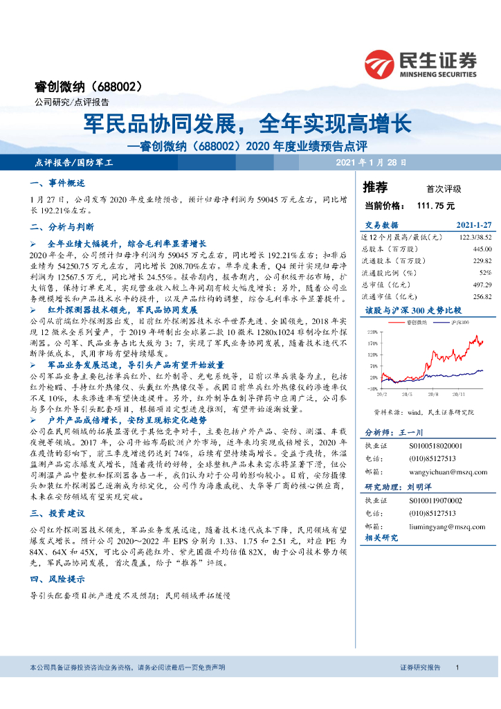 民生证券:睿创微纳(688002)-2020年度业绩预告点评:军民品协同发展,全年实现高增长.pdf