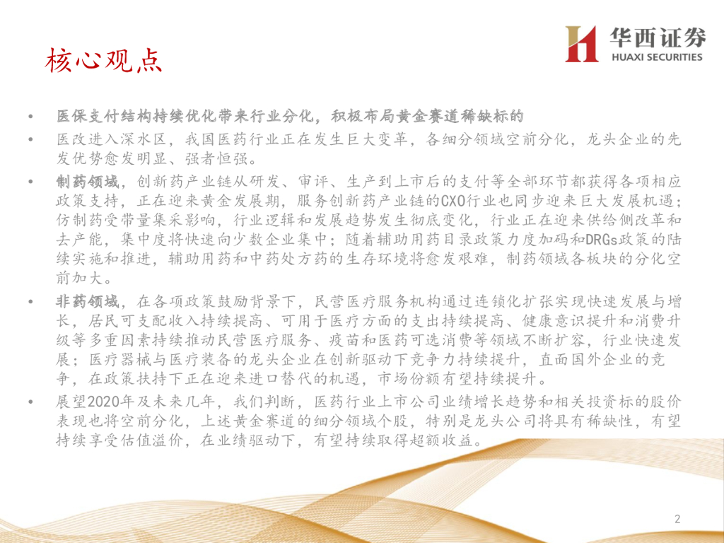 华西证券:2020年医药行业投资策略:医保支付结构持续优化带来行业分化,布局黄金赛道稀缺标的.pdf