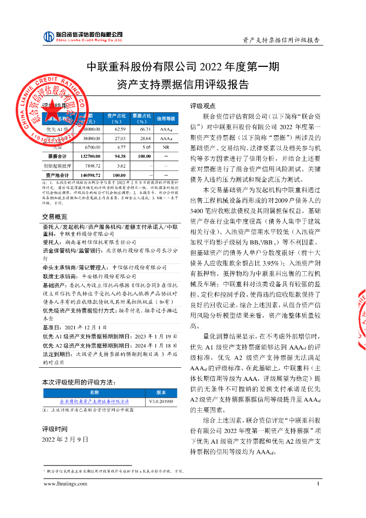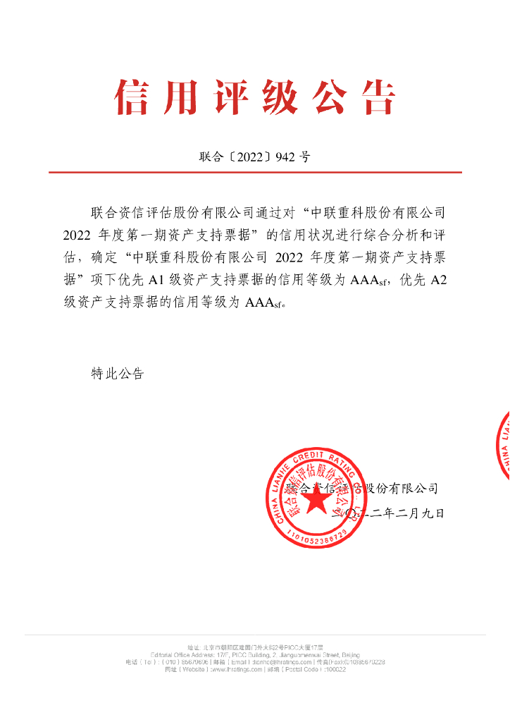 联合资信:中联重科股份有限公司2022年度第一期资产支持票据信用评级报告.pdf