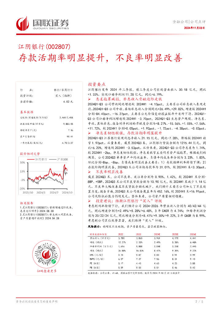 国联证券:江阴银行(002807)-存款活期率明显提升,不良率明显改善.pdf