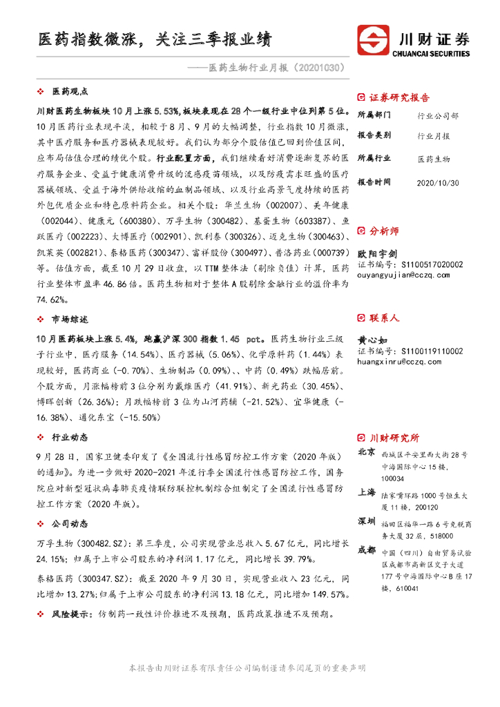 川财证券:医药生物行业月报:医药指数微涨,关注三季报业绩.pdf