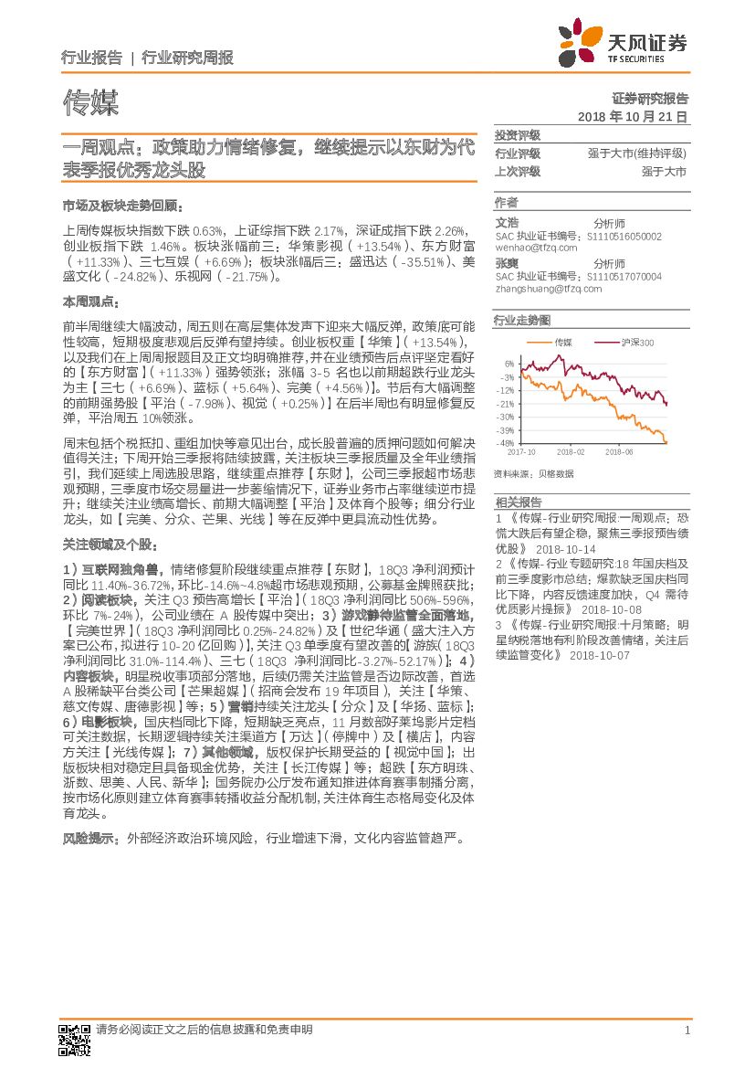 天风证券:传媒行业一周观点:政策助力情绪修复,继续提示以东财为代表季报优秀龙头股.pdf