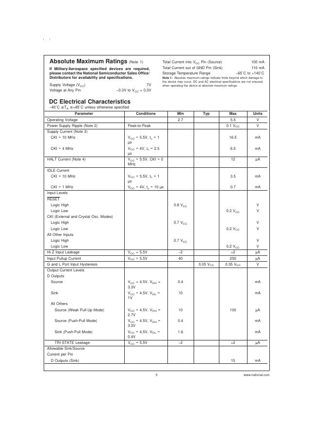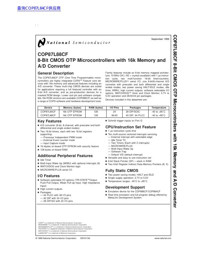 National semiconductor COP87L88CF 8-Bit CMOS OTP Microcontrollers with 16k Memory and A/D Converter 数据手册.pdf