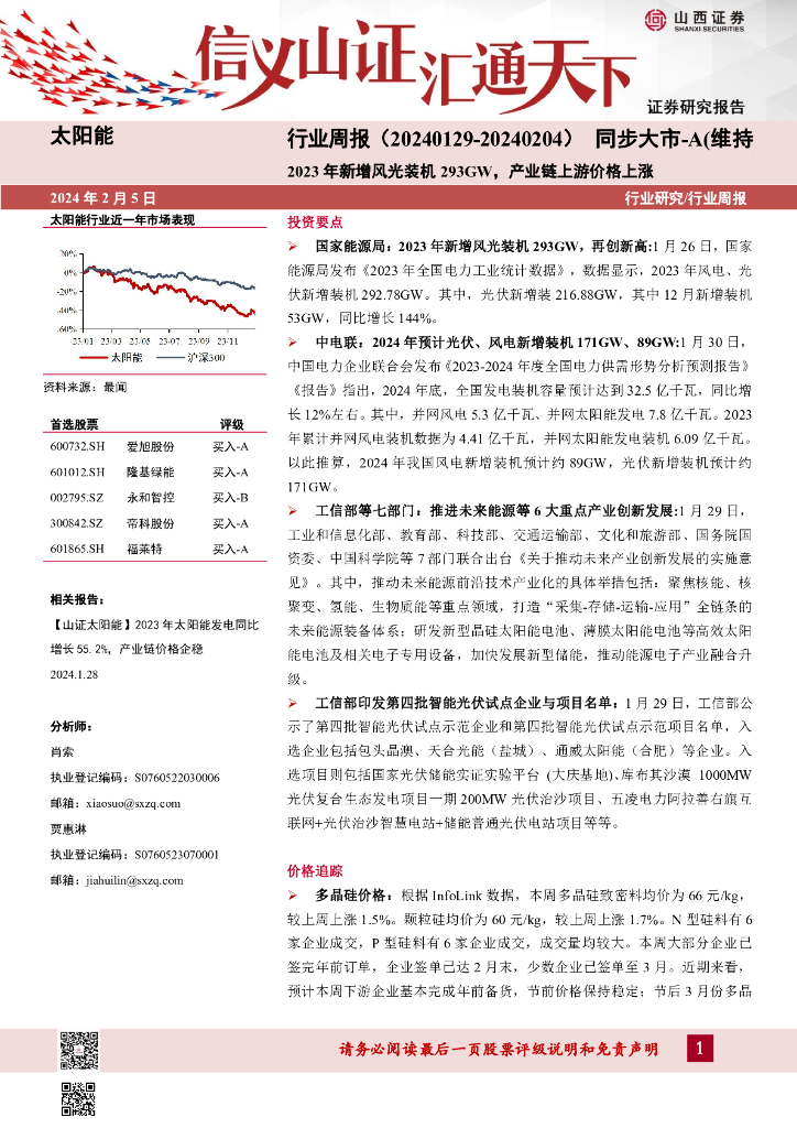 山西证券:太阳能行业周报:2023年新增风光装机293GW,产业链上游价格上涨.pdf