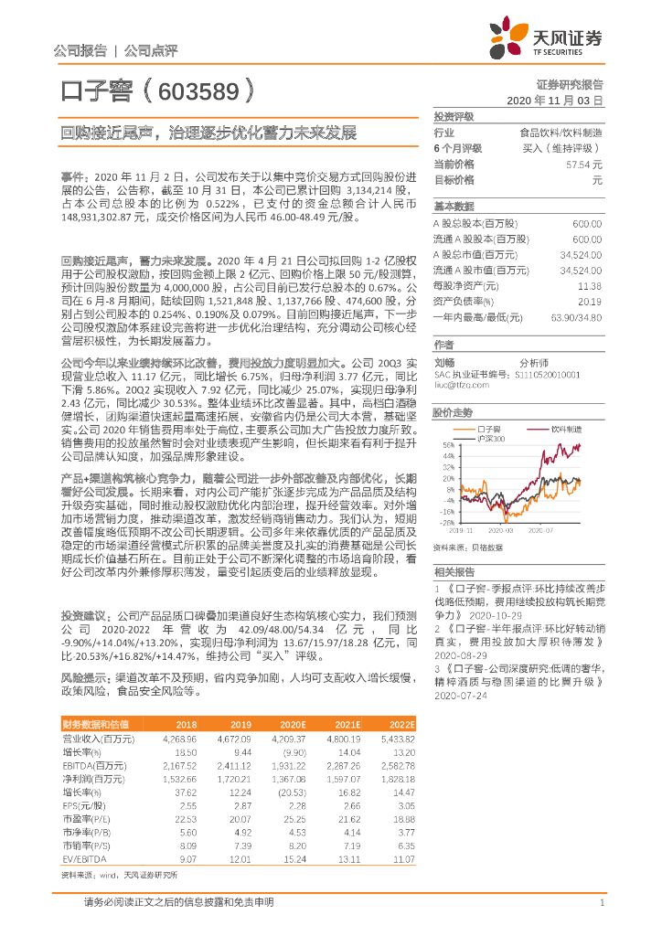 天风证券:口子窖(603589)-回购接近尾声,治理逐步优化蓄力未来发展.pdf