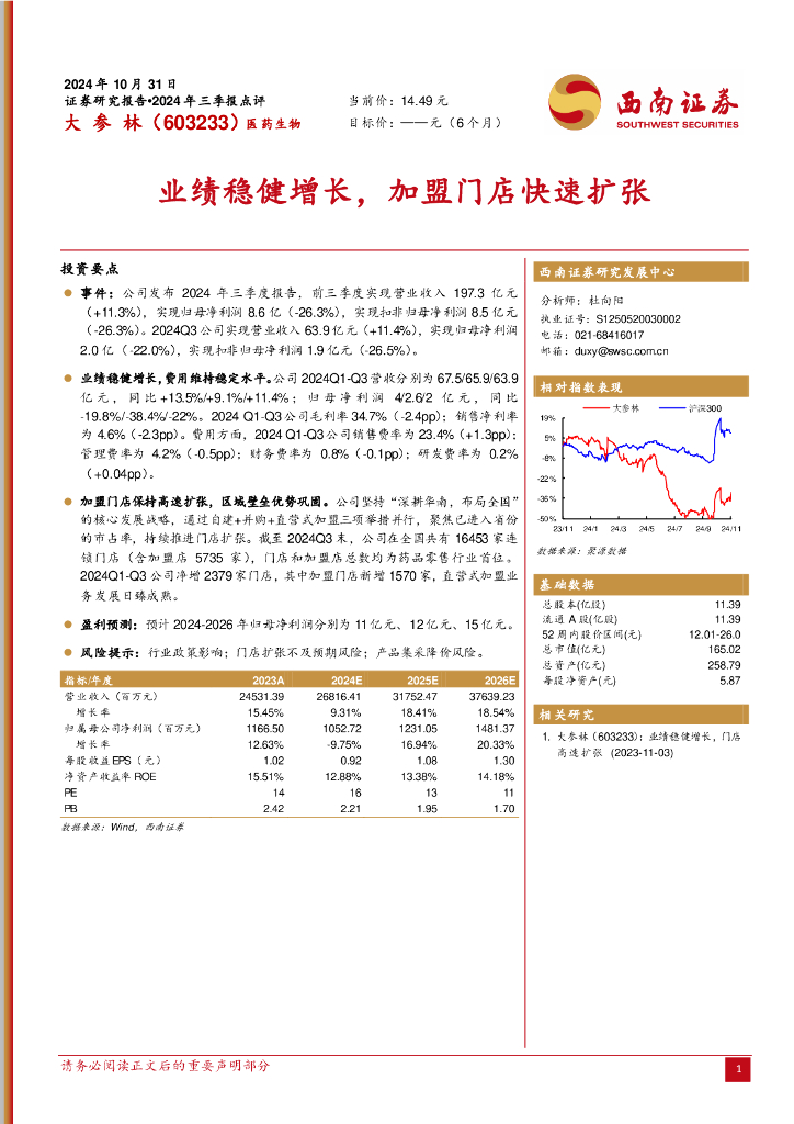 西南证券:大参林(603233)-业绩稳健增长,加盟门店快速扩张.pdf